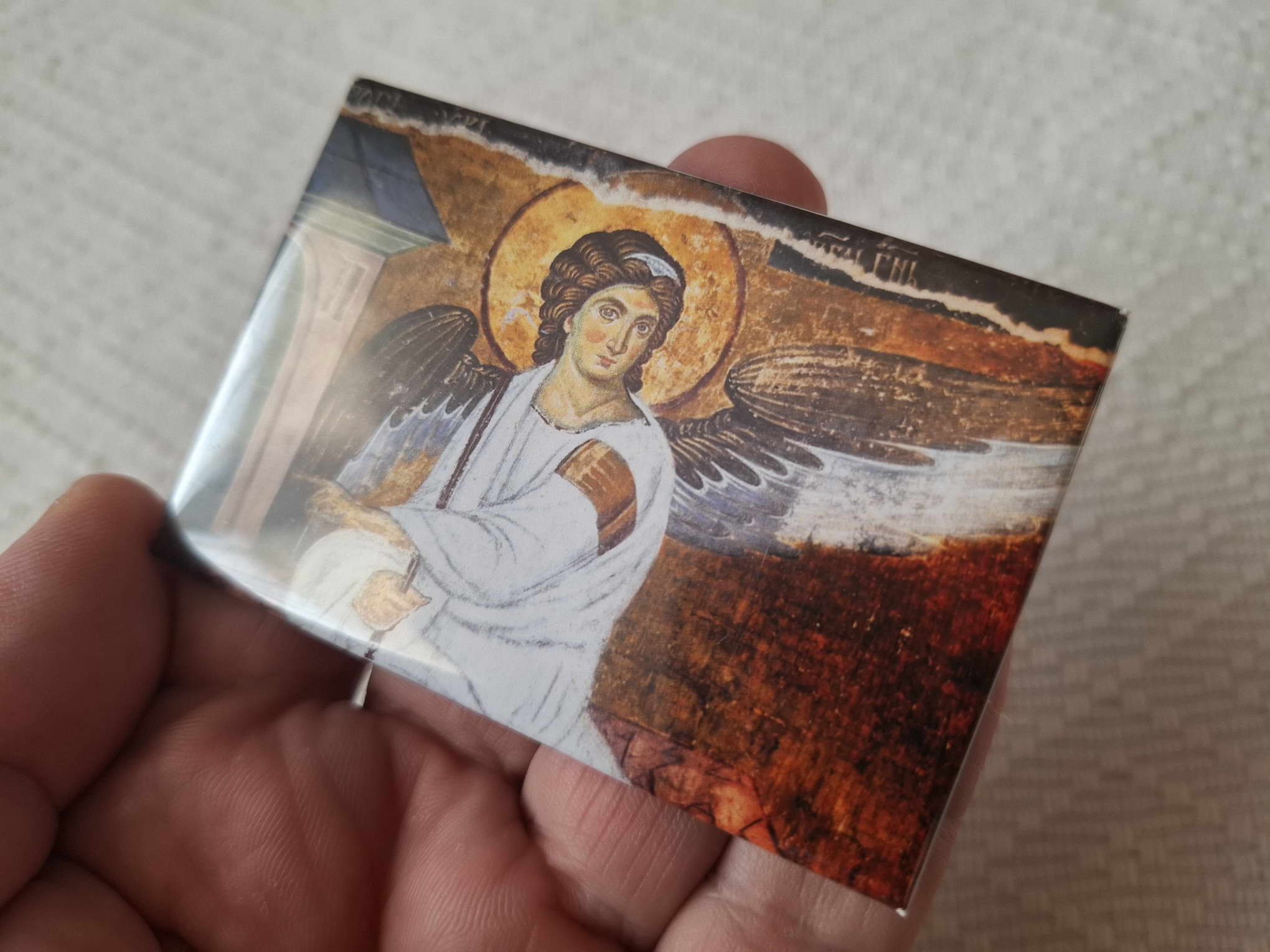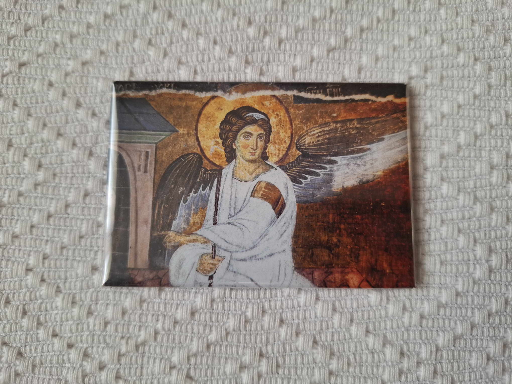 This is a small Serbian christian orthodox metal magnet icon of White Angel for fridge. It can also be used as a souvenir or be a good gift for your friend or relative.