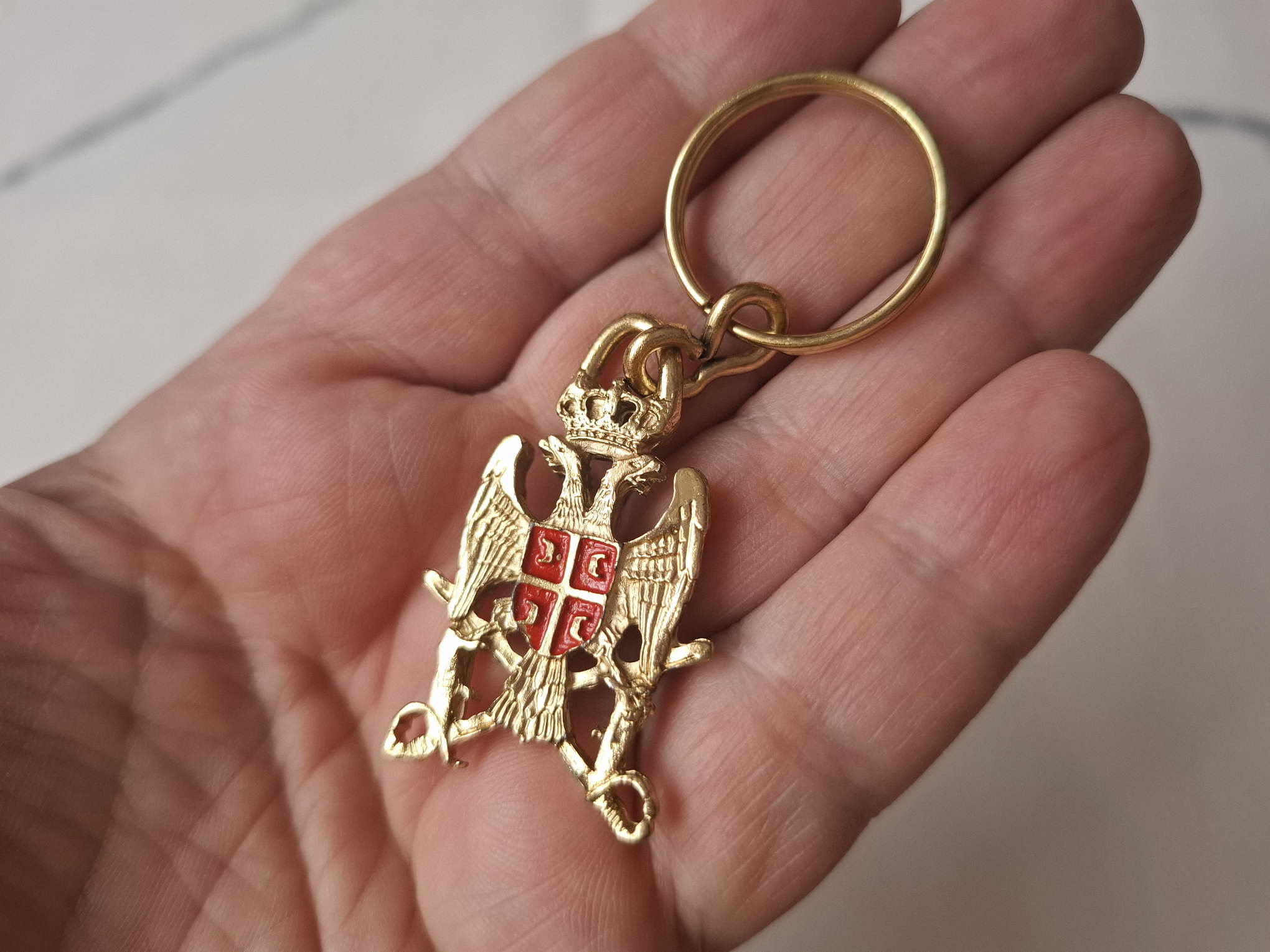 This is a very beautiful Serbian coat of arms key ring in a basic gold color. It is intended to be used as a key ring and can also be a good gift for your friend or relative.