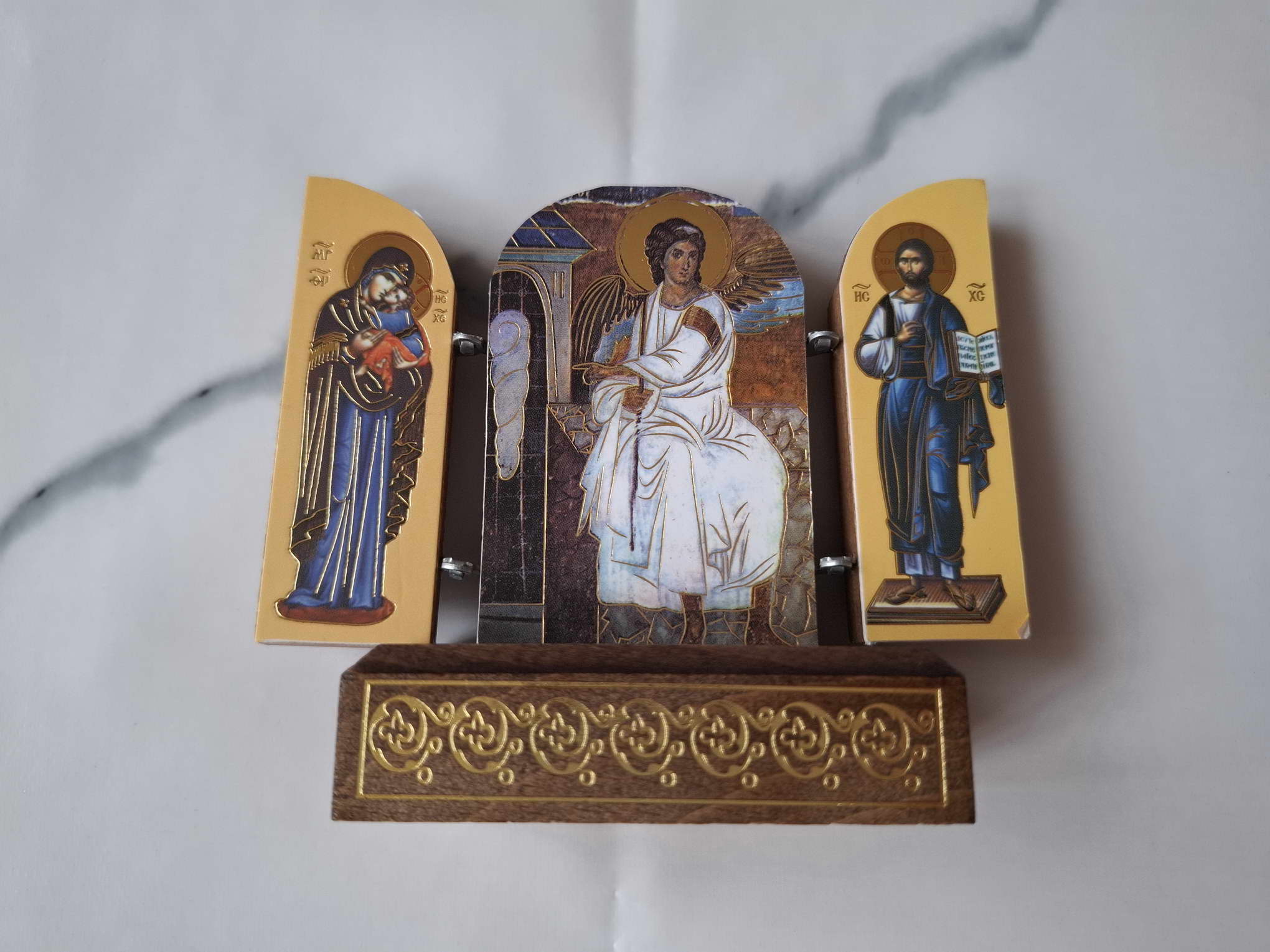 Serbian Orthodox Triptych Praying Icon Of Virgin Mary with Jesus Christ and White Angel