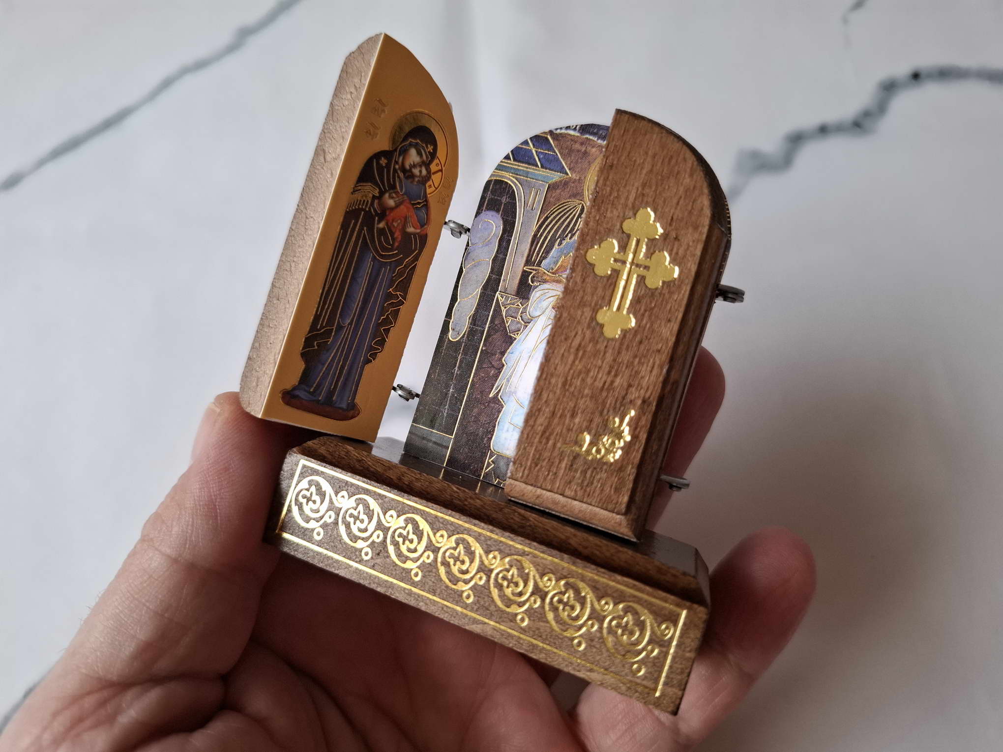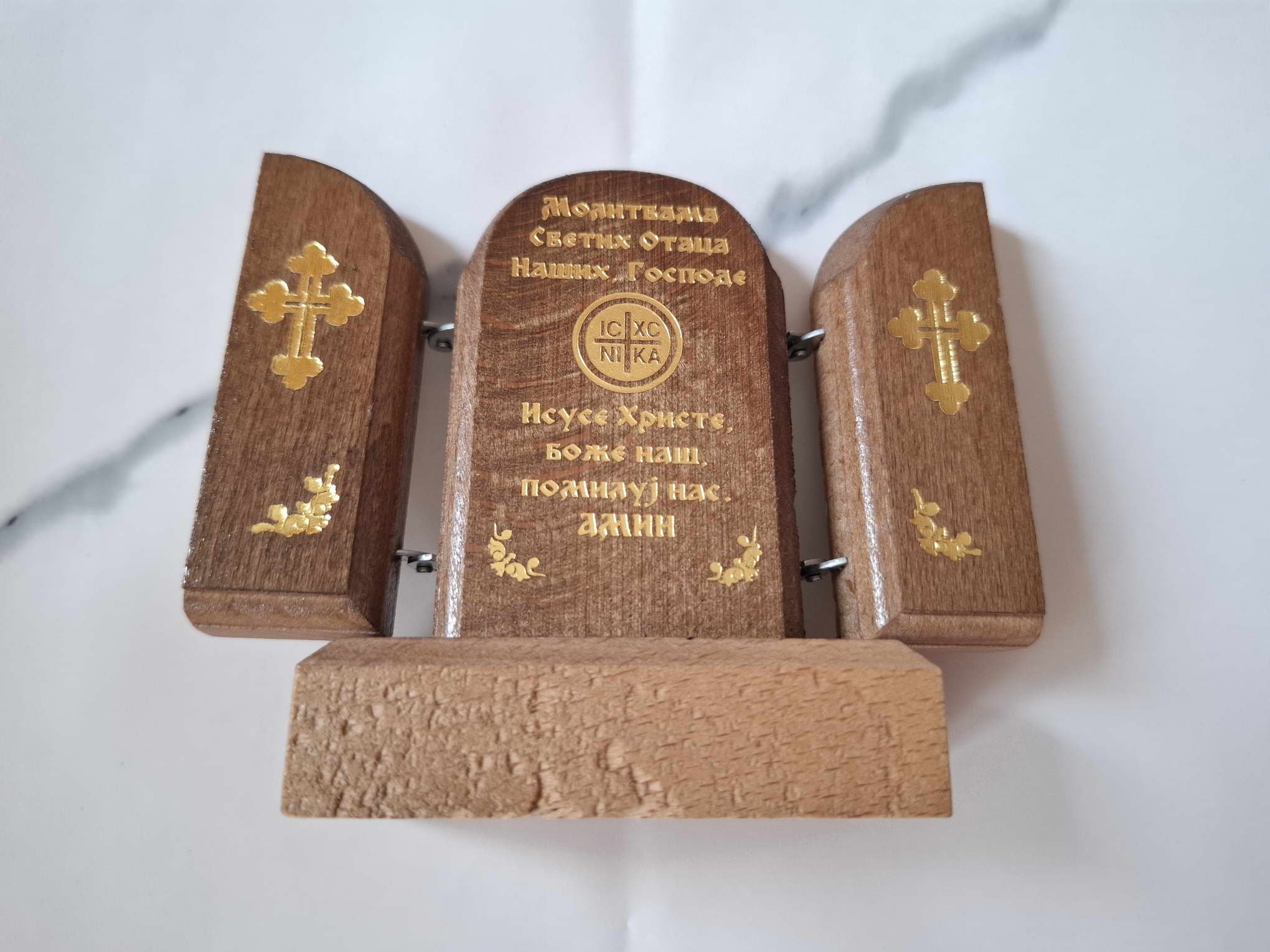 A very beautiful Serbian Orthodox triptych prayer icon. You can keep it on your desk or it can be a nice gift for your friend or relative. A priest of the Orthodox Church consecrated the icon.